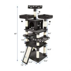 - Multi-tier 80-inch cat tree featuring a top perch with a bolstered perch cover, 6 partially wrapped sisal scratching posts, one regular condo and one extra roomy condo on the bottom.