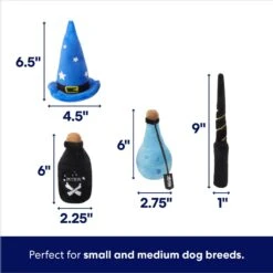 - This plush puzzle toy comes with a soft magic chest and four plush toys including a wand, a magician’s hat, and two potions. Each of the plush toys has crinkle paper and three have their own squeaker.